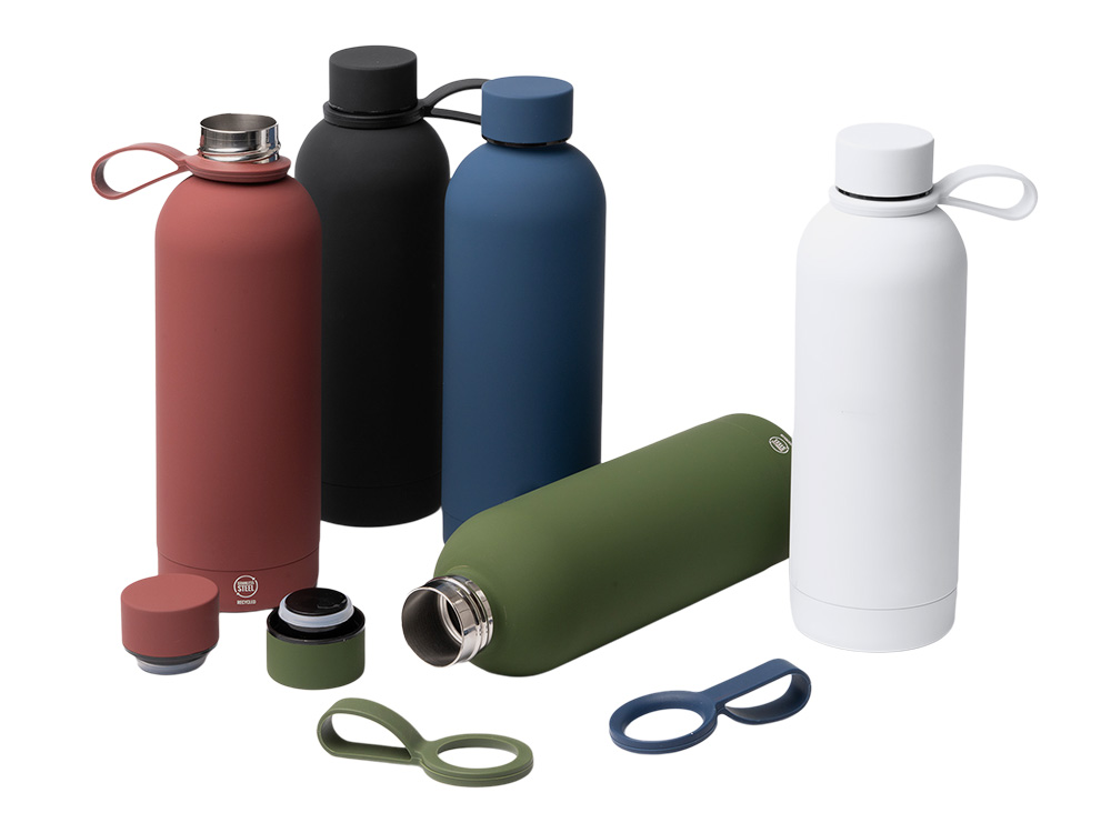 Термобутылка из переработанной нержавеющей стали 304. Мягкая прорезиненная поверхность на корпусе. Удобная силиконовая ручка для переноски. Оснащена противокапельной системой благодаря силиконовому кольцу, встроенному во внутреннюю часть крышки. Крышка и ручка соответствуют цвету корпуса. Объем: 500 мл. - Переработанная нержавеющая сталь 304 - Защита от капель - Нельзя мыть в посудомоечной машине - Поставляется в эко коробке